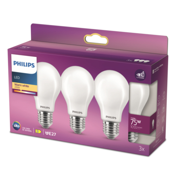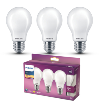 Met de Philips LED peerlamp mat E27 75W warmwit licht 3 stuks haal je energiezuinige en sfeervolle verlichting in huis. Dankzij de standaard E27-fitting zijn ze eenvoudig te plaatsen in bestaande armaturen. Door het lage verbruik van 8,5 W per lamp kun je tot wel €30 per lamp per jaar besparen op energiekosten.
