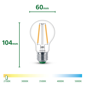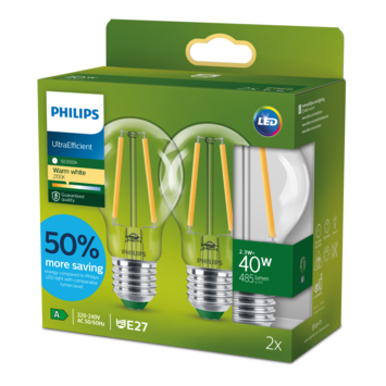 Met de Philips LED peerlamp UltraEfficient transparant E27 40W warmwit licht haal je krachtige en duurzame verlichting in huis. Deze filamentlampen behoren tot de meest energiezuinige modellen van Philips en zijn voorzien van energielabel A. Ze verbruiken tot 50% minder energie dan gewone LED-lampen en gaan tot wel 50.000 uur mee. Daardoor hoef je ze minder vaak te vervangen en bespaar je op lange termijn aanzienlijk op je energiekosten. De lampen hebben een standaard E27-fitting en werken op 230 V, waardoor ze eenvoudig te plaatsen zijn in bestaande armaturen.