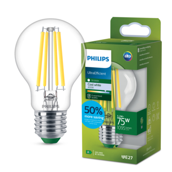 Met de Philips LED peerlamp UltraEfficient transparant E27 75W koelwit licht kies je voor energiezuinige verlichting die jarenlang meegaat. Deze heldere LED-filamentlamp met energielabel A verbruikt tot 50% minder energie dan traditionele LED-lampen en heeft een levensduur van maar liefst 50.000 uur. De standaard E27-fitting maakt de lamp eenvoudig te installeren in bestaande armaturen, waardoor je snel kunt profiteren van krachtige en efficiënte verlichting.