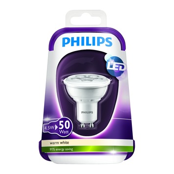 De Philips LED spot GU10 4,5W warm wit is geschikt als duurzame vervanging van uw 50W spots met een GU10-fitting. Deze lamp gaat 25000 uur mee en kan u tot wel 90% aan energieverbruik besparen. Bovendien is bij het innovatieve design gebruik gemaakt van materialen met een hoge kwaliteit. Ook in het ontwerp is dus rekening gehouden met de lange levensduur van deze lamp. Door de lange levensduur van deze Philips LED spot bespaart u uzelf dus het gedoe van het verwisselen van de spots. Daarnaast is de kleurweergave van deze lamp hoog, waardoor de kleuren van uw interieur een natuurlijke uitstraling krijgen. Kortom, van de Philips LED spot GU10 50W warm wit zult u lang plezier hebben.