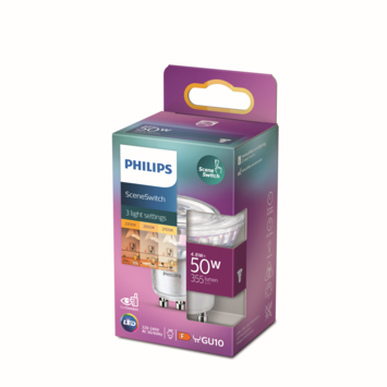 Met de Philips SceneSwitch LED-spot kunt u met uw bestaande schakelaar eenvoudig het lichtniveau aanpassen, van helder licht naar natuurlijk licht of een sfeervolle, warme gloed. U hebt geen dure dimmer of aanvullende installatie nodig. Bovendien heeft deze lamp een geheugenstand; daardoor onthoudt de lamp de laatste lichtstand, wanneer u de lamp voor langere tijd heeft uitgeschakeld. Met EyeComfort, voor licht dat aangenaam is voor uw ogen. Deze lamp heeft een GU10-fitting en gaat vaak perfect samen met uw in- of opbouwspots.