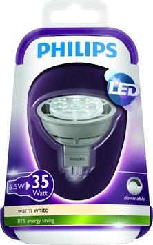 De Philips LED spot GU5.3 6,5W warm wit dimbaar is een halogeenspot geschikt voor een GU5.3 fitting. De spot heeft een vermogen van 6,5 watt, hiermee heeft de spot een lichtopbrengst van 330 lumen. Het heldere warmwitte licht van deze spot heeft een natuurlijke uitstraling waarin de kleuren van uw interieur goed tot hun recht komen. De spot creëert gerichte, heldere lichtbanen, waardoor u gemakkelijk lichtaccenten kunt aanbrengen. De spot heeft een lichthoek van 36 graden. De spot is dimbaar, zo kunt u zelf de lichtsterkte bepalen. Ook heeft deze lamp een levensduur van 20000 uur en is energiebesparend. De spot schijnt direct met maximale helderheid.
