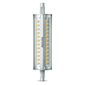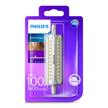 De Philips LED-lamp R7S 100 watt dimbaar is een goede vervanger van de halogeen R7S lichtbron. De LED-lamp heeft een wattage van 14 watt (vergelijkbaar met een traditionele halogeenlamp van 100 watt). Deze LED-lamp gaat lang mee en is zuinig in energie verbruik. Deze Philips lichtbron geeft een energiek koud licht en is een heldere verlichtingsbron. Deze LED-lamp is dimbaar zodat je de lichtsterkte naar behoeven kunt aanpassen. Kortom, de Philips LED-lamp R7S is een prettige verlichtingsbron.