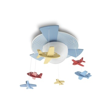 Philips myKidsRoom Avigo-plafondlamp, met het dessin van de wereld van de luchtmacht. De plafonnière wordt niet warm, is robuust en bevat geen giftige verf. De Philips myKidsRoom Avigo-plafondlamp wordt geleverd inclusief Philips lichtbron die zorgt voor een warm wit licht.