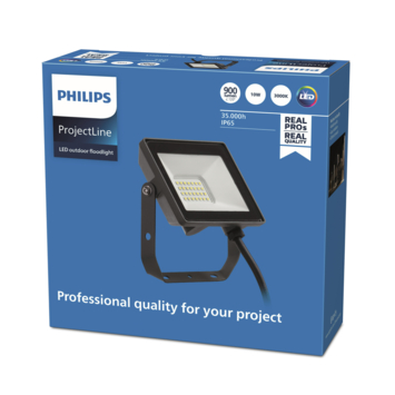 Waterdichte, robuuste LED-lamp voor buitenshuis. De Philips ProjectLine-schijnwerper (10 W) schijnt warmwit licht, is energiezuinig en ook nog eens weerbestendig. Deze robuuste buitenlamp kan tegen een stootje dankzij het gebruik van sterke metalen materialen. Ideaal voor het verlichten van terreinen aan de voor- of achterkant van (openbare) gebouwen, zoals parkeerplaatsen, opritten, tuinen of werkterreinen.