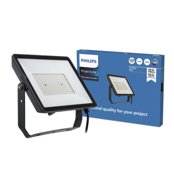 Waterdichte, robuuste LED-lamp voor buitenshuis. De Philips ProjectLine-schijnwerper (200 W) schijnt warmwit licht, is energiezuinig en ook nog eens weerbestendig. Deze robuuste buitenlamp kan tegen een stootje dankzij het gebruik van sterke metalen materialen. Ideaal voor het verlichten van terreinen aan de voor- of achterkant van (openbare) gebouwen, zoals parkeerplaatsen, opritten, tuinen of werkterreinen.