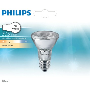 De Philips reflectorlamp eco E27 50W helder is een halogeenlamp geschikt voor een E27 fitting. De lamp heeft een vermogen van 50 watt, hiermee heeft de lamp een lichtopbrengst van 305 lumen. Het heldere licht van deze lamp verbetert het zicht en bevordert daarmee de concentratie. De lamp heeft een lichthoek van 25 graden. Ook heeft de lamp een levensduur van 2000 uur, twee keer zo lang als een standaard lamp. De lamp schijnt direct met maximale helderheid. Tevens kunt u de lamp dimmen, waardoor u zelf gemakkelijk de hoeveelheid licht kunt bepalen.