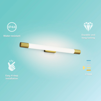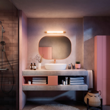 De Philips Rover badkamerspot heeft een strak, cilindervormig en watervast ontwerp en is geschikt voor montage boven of naast de badkamerspiegel. De messingkleurige afwerking geeft de lamp een moderne uitstraling die in vrijwel elk interieur past.