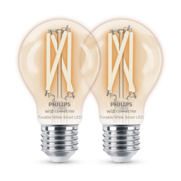 Verlicht je huis slim met deze twee trendy Philips Smart LED filamentlampen met een grote E27-fitting. Je kunt zelf instellen of de lampen warm- of koelwit licht geven. De lamp is eenvoudig te bedienen via de WiZ app. Dim de lampen, zet ze feller of kies één van de voorgeprogrammeerde lichtscènes. Stel bijvoorbeeld een 24-uurs ritme in en word wakker met koel licht om met wat extra energie aan de dag te beginnen. 's Avonds laat wordt het licht automatisch wat warmer, zodat je lekker ontspannen onder de wol kunt kruipen. Ontdek nog veel meer ritmes en scènes, waar je elke dag wat aan hebt. Gemakkelijk te bedienen via je eigen wifinetwerk met de WiZ app of je stem.