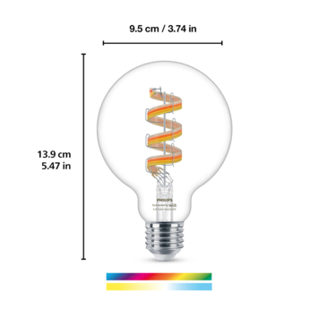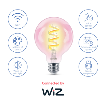Breng een vleugje vintage in je interieur met deze Philips Smart LED standaard filamentlamp. Deze decoratieve lamp is in staat om te stralen in talloze kleuren en wisselende tinten van warm tot koel wit licht. Hierdoor creëer je de perfecte atmosfeer voor elke gelegenheid. Met slimme verlichting profiteer je van de energiebesparende voordelen van LED-technologie. Bovendien zijn de Philips Smart LED lampen volledig compatibel met de WiZ connected technologie, waardoor je ze moeiteloos kunt bedienen via Wi-Fi met de WiZ app, een afstandsbediening of gewoon met je stem.