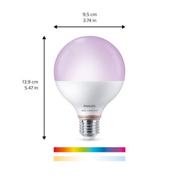 Haal de perfecte sfeer in huis met de ronde bolle vorm van deze gekleurde Philips Smart LED lamp met E27-fitting. De lamp is eenvoudig te bedienen via de WiZ app. Zo kun je de lampen gemakkelijk dimmen, feller zetten of één van de voorgeprogrammeerde lichtscènes kiezen. Gebruik ritmes om je lampen op bepaalde tijden automatisch van wittint of kleur te laten veranderen. Je kunt de ritmes naar wens aanpassen door verschillende dynamische lichtscènes te combineren. Wat dacht je van lampen die doen denken aan knus kaarslicht, een groene jungle of een kleurrijke herfstdag? Gemakkelijk te bedienen via je eigen wifinetwerk met de WiZ app of je stem.