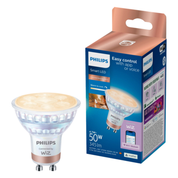 Maak de standaard inbouwlampen en spotjes in je huis slim met de aangename gloed van de Philips Smart LED GU10-spot, die je kunt instellen van warm- tot koelwit licht. Bedien de lamp via de WiZ app, en zorg dat je altijd het juiste licht hebt. Dim de lamp, zet hem feller of kies één van de voorgeprogrammeerde lichtscènes. Stel bijvoorbeeld een 24-uurs ritme in en word wakker met koel licht om met wat extra energie aan de dag te beginnen. 's Avonds laat wordt het licht automatisch wat warmer, zodat je lekker ontspannen onder de wol kunt kruipen. De spots hebben nu een verbeterd ontwerp; het kunststof kapje is vervangen door glas, wat zorgt voor een betere fit en een mooiere uitstraling. Gemakkelijk te bedienen via je eigen wifinetwerk met de WiZ app of je stem.