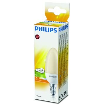 De Philips Softone spaarlamp Kaars E14 8W flame is een kaarsvormige spaarlamp uit de Philips Softone serie, geschikt voor een kleine fitting. Dankzij het zachte, warme licht van deze lamp wordt een ontspannen, gezellige sfeer gecreëerd. Ook zorgt het elegante ontwerp voor een stijlvolle, traditionele uitstraling. Met deze Philips Softone spaarlamp maakt u het dus eenvoudig gezellig in huis. Bovendien is deze lamp energiezuinig waardoor u tot 80% op energieverbruik kunt besparen. Kortom, de Philips Softone spaarlamp Kaars E14 8W flame is een duurzame sfeermaker.