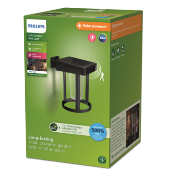 Philips solar wandlamp rond Camill zwart helder licht met bewegingssensor