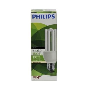 De Philips spaarlamp Genie E27 18W warm wit is een stickvormige, 18W spaarlamp geschikt voor een E27 fitting. Het warmwitte, heldere licht van deze lamp heeft een lichtopbrengst van 1100 lumen. Dit maakt de lamp ideaal voor plaatsen waar u wel wat extra licht kunt gebruiken. Daarnaast valt deze lamp in energieklasse A, wat betekent dat u tot wel 80% op energieverbruik kunt besparen. Met deze Philips Genie spaarlamp heeft u dus helder en energiezuinig licht. Bovendien heeft de lamp een levensduur van 10000 uur, waardoor u lang van de lamp kunt genieten. Kortom, de Philips spaarlamp Genie E27 18W warm wit is een duurzame spaarlamp voor helder licht.