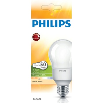 Met de Philips Spaarlamp softone 12W E27 grote fitting dimbaar creëert u in elk vertrek een aangename sfeer. Dankzij het zachte licht is de lamp prettig voor uw ogen. Omdat de lamp maar liefst 10 jaar meegaat hoeft u d lamp zelden te vervangen De Philips Spaarlamp softone 12W E27 grote fitting dimbaar combineert een klassiek ontwerp met duurzame techniek. Door de dimmende functie bepaalt u zelf de hoeveelheid licht. Met de Philips Spaarlamp softone 12W E27 grote fitting dimbaar denkt u aan het milieu en uw portemonnee.