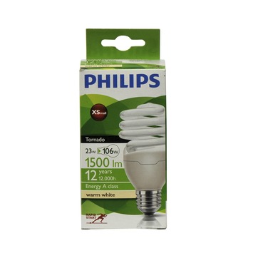 De Philips spaarlamp Tornado E27 23W warm wit is een spiraalvormige, 23W spaarlamp geschikt voor een grote fitting. Het heldere, energieke licht met een lichtopbrengst van 1570 lumen, creëert een actieve sfeer. Bovendien is het energieverbruik van deze lamp laag waardoor u tot 80% op energieverbruik kunt besparen. Deze Philips spaarlamp Tornado biedt dus actief en toch energiezuinig licht. Ook gaat de lamp met een levensduur van 10000 uur lang mee. Kortom, de Philips spaarlamp Tornado E27 23W warm wit is een duurzame lamp voor actief licht.