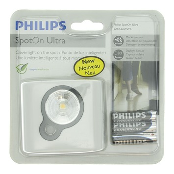 Haal een handige lamp in huis met de Philips SpotOn Ultra draadloze lamp zilver. Dankzij het ontbreken van een draad kunt u de lamp overal gemakkelijk ophangen. Door de daglichtsensor weet de lamp wanneer hij licht moet verschaffen. Bevestig de Philips SpotOn Ultra draadloze lamp zilver in kastjes om ook daar alles te kunnen zien. Door de meegeleverde accessoires kunt u de lamp over makkelijk op elk oppervlakte plaatsen. Donkere hoekjes zijn verleden tijd met de Philips SpotOn Ultra draadloze lamp zilver