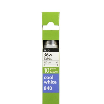 De Philips TL-buis 36W cool white is een fluorescentielamp van 36 watt. De lamp heeft een lichtopbrengst van 3350 lumen. Hierdoor is de TL-buis geschikt als heldere verlichtingsbron. Deze TL-buis geeft een koel wit licht dat zorgt voor een energiek gevoel. De lamp heeft circa 10.000 branduren en gaat dus lang mee. Kortom, de Philips TL-buis is een goede verlichtingsbron in donkere werkruimtes.