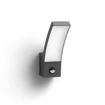 De antraciete Philips Splay muurlamp geeft je huis een moderne uitstraling. Gebruik deze eigentijdse lantaarn om je entree te verlichten met diffuus, warmwit licht. Door de ingebouwde bewegingssensor springt de lamp automatische aan bij bezoek of ongewenste gasten. Dit geeft een je een veilig gevoel.