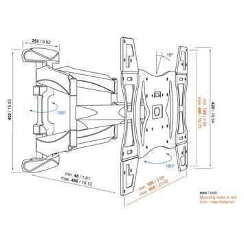 Deze draai- en kantelbare TV-steun van Physix by Vogel's komt slechts 4,6 cm van de wand. Deze beugel is geschikt voor TV's van 102cm tot 165cm of van 40" tot 65". Deze maten worden diagonaal gemeten. Het maximale gewicht van de TV bedraagt 45kg. Bij deze beugel worden alle bevestigingsmaterialen meegeleverd. De maximale bevestigingsmaten (VESA) van de TV zijn 600 x 400mm.