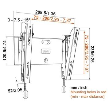 Deze kantelbare TV-beugel van Physix by Vogel's komt slechts 5,2 cm van de wand. Deze beugel is geschikt voor TV's van 48cm tot 102cm of van 19" tot 40". Deze maten worden diagonaal gemeten. Het maximale gewicht van de TV is 20kg. Bij deze TV-beugel worden alle bevestigingsmaterialen meegeleverd. De maximale bevestigingsmaten (VESA) van de TV zijn 200 x 200mm.