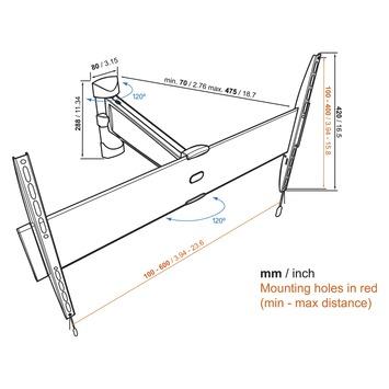 Deze draaibare TV-beugel van Physix by Vogel's komt slechts 7 cm van de wand. Deze steun is geschikt voor TV's van 102cm tot 165cm of van 40" tot 65". Deze maten worden diagonaal gemeten. Het maximale gewicht van de TV is 45kg. Bij deze beugel worden alle bevestigingsmaterialen meegeleverd. De maximale bevestigingsmaten (VESA) van de TV zijn 600 x 400mm.