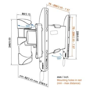 Deze draaibare TV-beugel van Physix by Vogel's komt slechts 6,2 cm van de wand. De steun is geschikt voor TV's 48cm tot 109 cm of van 19" tot 43". Deze maten worden diagonaal gemeten. Het maximale gewicht van de TV is 20kg. Bij deze steun worden alle bevestigingsmaterialen meegeleverd. De maximale bevestigingsmaten (VESA) van de TV zijn 200 x 200mm.