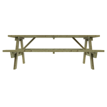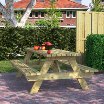 De picknicktafel is gemaakt van vuren hout. Om de levensduur te verlengen wordt deze houtsoort vacuümdruk geïmpregneerd. Deze methode zorgt ervoor dat de levensduur verlengd wordt tot 10-15 jaar en dat het hout resistent wordt tegen (oppervlakte) schimmels. De picknicktafel wordt als bouwpakket, inclusief bevestigingsmateriaal, geleverd. Met de meegeleverde, stapsgewijze montagehandleiding kan de picknicktafel zo opgebouwd worden.