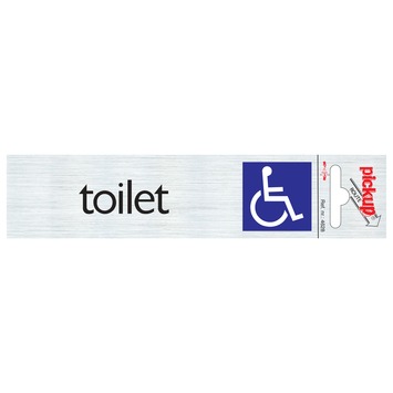 Het Pickup Alu deurbordje toilet toegankelijk voor rolstoel 165x44mm is zelfklevend. Daardoor brengt u het deurbordje eenvoudig aan. De aluminiumlook geeft dit bordje een luxe, moderne en tijdloze uitstraling. Het bordje heeft een herkenbaar pictogram van een rolstoel en een goed leesbare tekst. Zo communiceert u uw boodschap helder. Dit deurbordje maakt deel uit van een serie die bestaat uit diverse producten waarmee u eenvoudig richting of andere signalen kunt communiceren. Het Pickup Alu deurbordje toilet toegankelijk voor rolstoel is snel te bevestigen en geeft duidelijk aan waar het invalidentoilet zich bevindt. Afmeting: 165mm lang en 44mm hoog.