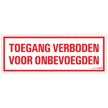 Dit Pickup bord toegang verboden voor onbevoegden 33x12cm is gemaakt van polystyreen en maakt deel uit van een serie speciaal ontwikkelde borden om verboden, geboden en waarschuwingen mee te communiceren. Het wit met rode, rechthoekige bord bevat een duidelijke boodschap. U kunt het kwalitatief hoogwaardige bordje eenvoudig bevestigen met schroeven of montagelijm. Dit Pickup bord toegang verboden voor onbevoegden geeft duidelijk aan dat onbevoegden op deze locatie geen toegang hebben. Afmetingen: 33cm breed en 12cm hoog.