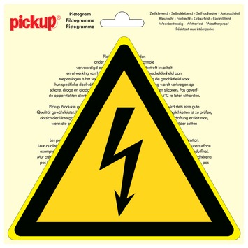Het Pickup pictogram gevaar elektrische spanning 20x20cm is een zelfklevende vinyl sticker. De zwart met gele, driehoekige sticker is zowel binnen als buiten te gebruiken, zo lang u deze op een glad oppervlak bevestigt. De sticker hecht uitstekend, maar is ook goed te verwijderen zonder lijmresten achter te laten. Deze sticker maakt deel uit van een assortiment Pickup stickers. Deze bieden duidelijkheid op het gebied van gebod, verbod, veiligheid, waarschuwing, brandbestrijding, vluchtweg of andere informatie. Voor elk probleem is een passende oplossing te vinden. Kortom, het Pickup pictogram gevaar elektrische spanning waarschuwt voor de aanwezigheid van elektrische spanning. Afmetingen: 20x20cm.