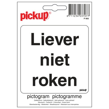 Het Pickup pictogram liever niet roken 10x10cm is een zelfklevende vinyl sticker. De zwart-witte sticker is zowel binnen als buiten te gebruiken, zo lang u deze op een glad oppervlak bevestigt. De sticker hecht uitstekend, maar is ook goed te verwijderen zonder lijmresten achter te laten. Deze sticker maakt deel uit van een assortiment Pickup stickers. Deze bieden duidelijkheid op het gebied van gebod, verbod, veiligheid, waarschuwing, brandbestrijding, vluchtweg of andere informatie. Voor elk probleem is een passende oplossing te vinden. Kortom, het Pickup pictogram liever niet roken wijst mensen erop dat op de betreffende locatie beter niet gerookt kan worden. Afmetingen: 10x10cm.