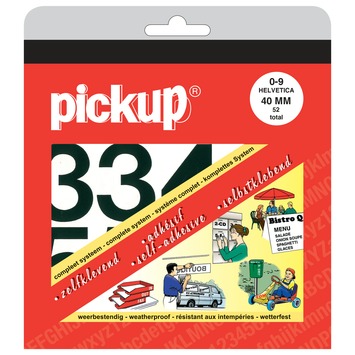 Met de Pickup plakcijfers 0-9 Helvetica zwart 40mm plakt u zonder moeite cijfers op een glad oppervlak. De stickers zitten in een boekje, voorzien van een gebruiksaanwijzing en een siliconenvel met ruitjes. Hierop kunt u de zwarte cijfers netjes positioneren. Met het zelfklevende strookje brengt u vervolgens de cijfers over op het te beplakken voorwerp. De boekjes met plakletters en -cijfers zijn in verschillende kleuren, maten en lettertypes verkrijgbaar. U kunt ze zowel binnen als buiten gebruiken. Ze hechten prima, maar zijn ook goed te verwijderen zonder lijmresten achter te laten. De stickerboekjes zijn ideaal voor thuis, op kantoor, hobby of puur ter decoratie. Afmetingen: 40mm.