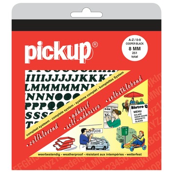 Pickup plakletters A-Z en cijfers 0-9 zwart 8mm plakt u eenvoudig op elk glad oppervlak. Het meegeleverde siliconenvel met ruitjes helpt u de cijfers en letters netjes recht te plaatsen. Hierdoor plakt u nooit scheef. In de verpakking vindt u ook een zelfklevend strookje. Hiermee brengt u de stickers simpel aan op het voorwerp dat u wilt beplakken. Pickup plakletters en cijfers A-Z en cijfers 0-9 zwart 8mm zijn geschikt voor binnen en buiten. Ze hechten uitstekend en toch zijn ze goed te verwijderen, zonder vervelende lijmresten achter te laten. Kortom, Pickup plakletters en cijfers A-Z en cijfers 0-9 zwart 8mm zijn een prima keuze voor kantoor, thuis, hobby en decoratieve uitingen.