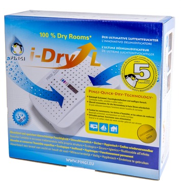 De i-Dry L heeft een robuuste, eenvoudig te reinigen behuizing. Vergeleken met traditionele elektrische ontvochtigers is de i-Dry zeer veelzijdig in gebruik. Het apparaat benodigd geen batterijen of vaste netaansluiting om te ontvochtigen. Dit maakt het ideaal te gebruiken in kleine ruimtes zoals laden, bewaardozen, kasten, boekenplanken, de kofferbak en badkamerkastjes - eigenlijk overal waar u geen stopcontact bij de hand heeft. Ophanghaak en stroomkabel voor herlading worden standaard meegeleverd.