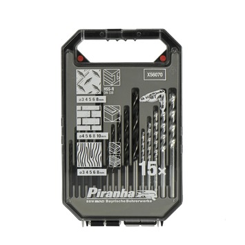 De 15-delige Piranha combikit borenset x56070-qz bestaat uit 5 HSS-boren met een diameter van 3, 4, 5, 6 en 8mm, 5 houtspiraalboren met een diameter van 3, 4, 5, 6 en 8mm en 5 steenboren met een diameter van 4, 5, 6, 8 en 10mm.