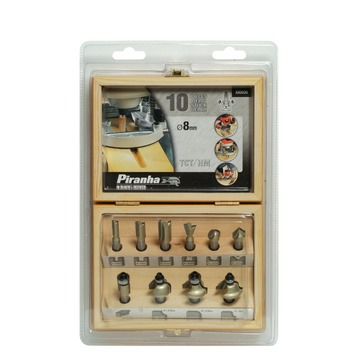 Piranha frezenset X80020-XJ is geschikt voor alle bovenfrezen met een 8mm aansluiting. Door het nauwkeurige geometrisch design hebben de frezen een zeer laag vibratieniveau. TCT staal voor lange levensduur. De frezen zitten in een fraai gelakt, overzichtelijk opbergkistje. Inhoud: 10 frezen. Voldoen aan de EU standaard voor veiligheideisen (Holz-BG gecertificeerd).