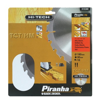 Het Piranha HI-TECH cirkelzaagblad TCT-HM x15380-xj is geschikt voor zwaar gebruik. Snel zagen in gebruikt hout met specieresten en spijkers, hardhout of zachthout is geen enkel probleem met dit zaagblad. Het blad heeft een extra sterke wigvormige schouder en de 18 hardmetalen tanden zijn herslijpbaar. Het cirkelzaagblad x15380 heeft een diameter van 190mm en een asgat van 30mm. Dit zaagblad is onder meer geschikt voor de AEG HK66, de Bosch PKS66 en de SKIL 1965U.