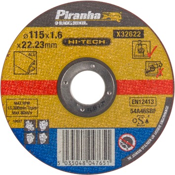De Piranha HI-TECH aluminiumdoorslijpschijf x32622-qz 1,6x115mm is geschikt voor het doorslijpen van aluminium. De slijpschijf is plat, heeft een diameter van 115mm maar is slechts 1,6mm dik. Omdat hij zo dun is kunt u er snel mee werken en verliest u minder materiaal. De metaaldoorslijpschijf is bruikbaar in combinatie met bijna alle gangbare haakse slijpers.