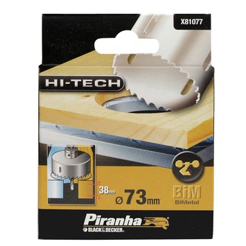 De Piranha HI-TECH bimetaal gatenzaag x81077-xj 73mm is de oplossing voor het maken van gaten met grote diameters in verschillende materialen. Deze gatenzaag kunt u op een elektrische boormachine monteren om gaten te zagen in hout en metaal. De x81077-xj wordt geleverd zonder booradapter. De zaag heeft een diameter van 73mm en is 48mm diep.