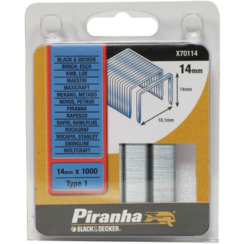 Piranha type 1 nieten 14mm x70114-qz 1000 stuks zijn nieten met een ronde draad voor algemeen gebruik van superkwaliteit. De nieten zijn te gebruiken voor het bevestigen van stof, karton en hout en zijn te gebruiken in onder andere Arrow-, Black&Decker-, Bosch-, KWB-, Lux-, Metabo-, Novus-, Rapid en Wolfcraft-nietapparaten. De x70114-qz nieten zijn 10,1mm lang en 14mm diep en worden geleverd in een verpakking van 1000stuks.