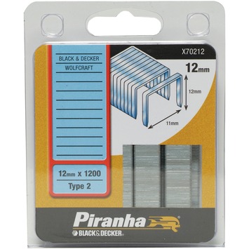 Piranha type 2 nieten 12mm x70212-qz 1200 stuks zijn nieten met een platte draad voor algemeen gebruik van superkwaliteit. De nieten zijn te gebruiken voor het bevestigen van stof, karton, hout en tapijt en zijn te gebruiken in onder andere Black&Decker- en Wolfcraft-nietapparaten. De x70212-qz nieten zijn 11mm lang en 12mm diep en worden geleverd in een verpakking van 1200stuks.