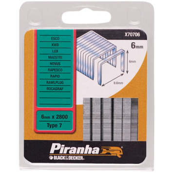 Piranha nieten X70706-QZ hebben een breedte van 9,6mm en een hoogte van 6mm. Type 7. Inhoud: 2800 stuks.