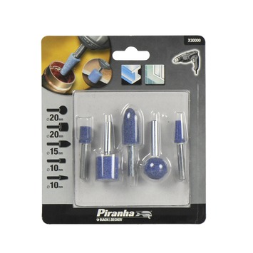 De Piranha slijpsteenset x30000-xj bestaat uit 5 slijpstenen met verschillende vormen voor het bewerken van metaal. De slijpstenen zijn te gebruiken in combinatie met uw boormachine.