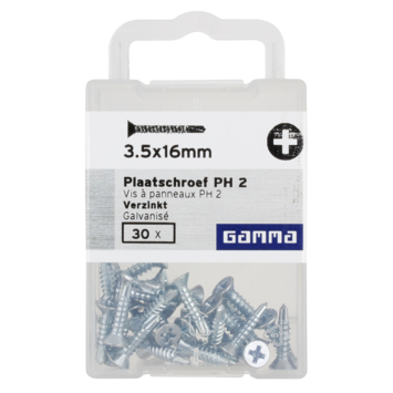 Met Gamma plaatschroeven met boorpunt bevestigd u eenvoudig harde plaatmaterialen en plastic panelen op houten delen. Deze 3,5X16 verzinkt plaatschroef heeft een cilinderkop voor een bevestiging waarbij de schroefkop mooi verzonken is. Plaatschroeven met boorpunt worden ook Zelfborende Plaatschroeven en boorschroeven genoemt.
