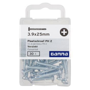 Met Gamma plaatschroeven met boorpunt bevestigd u eenvoudig harde plaatmaterialen en plastic panelen op houten delen. Deze 3,9X25 verzinkt plaatschroef heeft een cilinderkop voor een eenvoudige bevestiging. Plaatschroeven met boorpunt worden ook Zelfborende Plaatschroeven en boorschroeven genoemt.