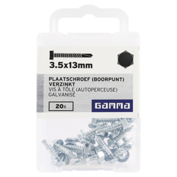 Met Gamma plaatschroeven met boorpunt bevestigd u eenvoudig harde plaatmaterialen en plastic panelen op houten delen. Deze 3,5X13 Verzinkt plaatschroef heeft een zeskantkop voor een stevige bevestiging. Plaatschroeven met boorpunt worden ook zelfborende plaatschroeven en boorschroeven genoemt.
