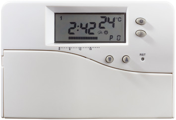 Deze Milton klokthermostaat van Plieger regelt de temperatuur d.m.v. een eenvoudig in te stellen schakelprogramma. Als de temperatuur in de ruimte, waar de thermostaat is geplaatst, lager wordt dan de geprogrammeerde waarde, dan schakelt de klokthermostaat de CV-ketel in. Als de ruimte weer op de geprogrammeerde temperatuur is, schakelt de klokthermostaat de CV-ketel uit. Deze klokthermostaat heeft een duidelijk LCD-scherm waarop o.a. de heersende temperatuur en tijd worden getoond.Klokthermostaten kunnen worden toegepast in woningen die zijn aangesloten op stadsverwarming. Het is echter noodzakelijk dat de hoofdregel-afsluiter van de stadsverwarming is voorzien van een elektrisch bediende afsluiter-motor. Deze motor moet geschikt zijn voor zwakstroom 24 V besturing (bij twijfel informeren adviseren wij u hiernaar te informeren bij uw warmwater-toeleverancier). Indien hieraan wordt voldaan, is het mogelijk om via een tweedraads-zwakstroom aansluiting de klokthermostaat in de kamer te monteren en aan te sluiten. Als een klokthermostaat wordt toegepast bij stadsverwarming, moet er in de regel een verstelling van het aantal schakelingen per uur worden gemaakt op de klokthermostaat.