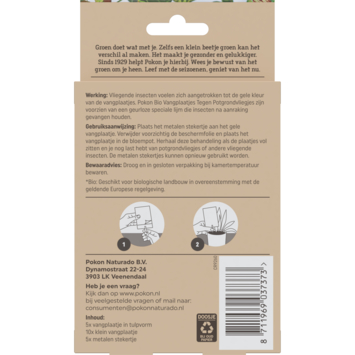 Ervaar je overlast van potgrondvliegjes of andere vliegende insecten rond je planten? Pokon Bio vangplaatjes tegen potgrondvliegjes bieden een snelle en veilige oplossing. De vangplaatjes zijn felgeel om insecten aan te trekken en gebruiken een geurloze speciale lijm om ze vast te houden. Ze zijn insecticidenvrij en zorgen daarmee voor een directe afname van het aantal insecten zonder je planten te schaden. In de set vind je 5 tulpvormige vangplaatjes, 10 kleine vierkante plaatjes en 5 herbruikbare metalen stekertjes. Knip de vierkante plaatjes doormidden langs de aangegeven rand, bevestig ze aan de stekertjes en verwijder de beschermfolie. Zet ze in de bloempot bij je planten. Vul nieuwe plaatjes aan wanneer de oude vol zitten. Gebruik per plant één vangplaatje voor het beste effect. Met deze eenvoudige en effectieve oplossing hou je ongewenste vliegers uit de buurt van je plantenkwekerij.